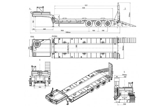 47000 кг, шины 395/85R20 или 445/65R22,5 / 6+1, платформа 11502 по трапам) x 2500 с уширителями до 3000 мм, треугольные аппарели, ССУ 1530 мм, рессорная подвеска, раздвижные коники 1500 мм