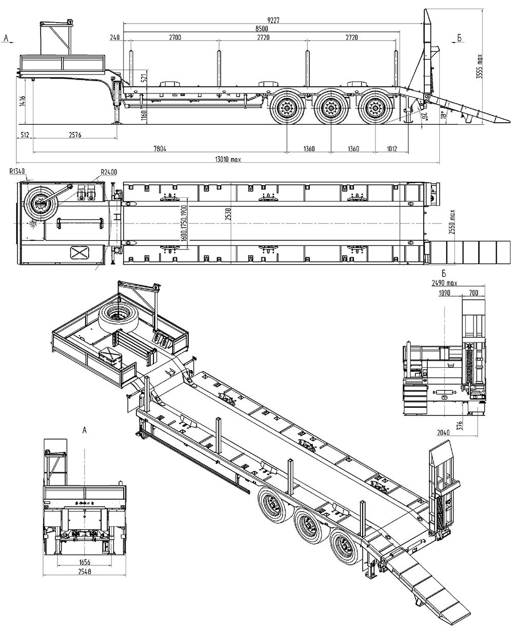 39000 кг, шины 385/65R22,5 или 445/65R22,5 / 6+1, платформа 11461 по трапам x 2500 с уширителями до 3000 мм, треугольные аппарели, ССУ 1430 мм, рессорная подвеска, съемные стойки или раздвижные коники 1500 мм, с бортами или без