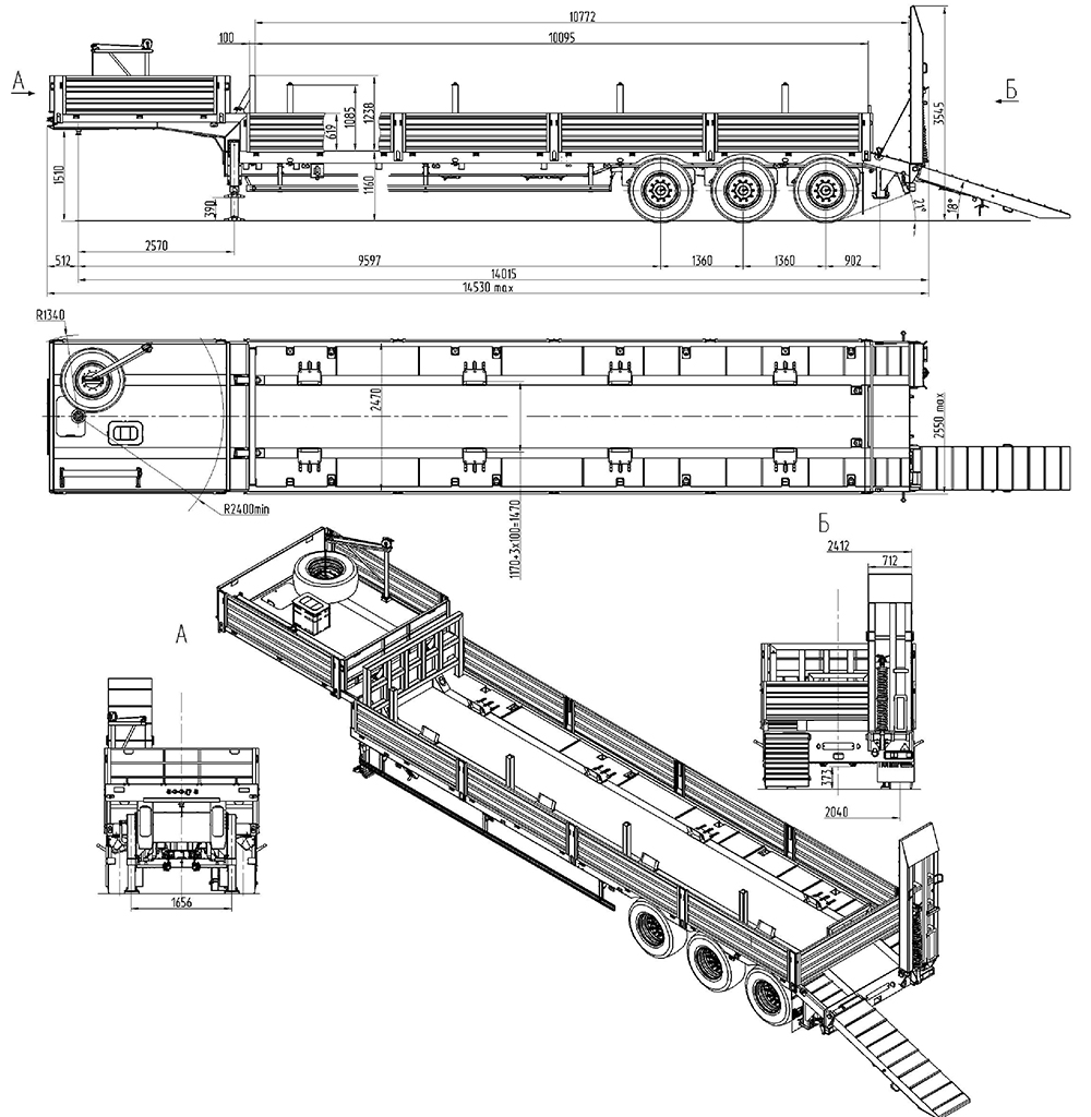 30200 кг, шины 385/65R22,5/6+1, платформа 10095 (10772 до трапов) x 2530, ССУ 1510 мм, рессорная или пневматическая подвеска, съемные стойки, передний щит, съемные борта по всей длине