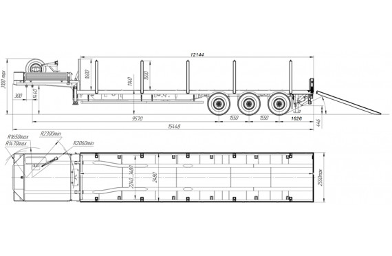 36000 кг, шины 385/65R22,5 или 445/65R22,5 / 6+1, платформа без трапов (12200 x 2500 мм, ССУ 1430 мм, пневматическая подвеска, раздвижные коники 1500 мм, съемные борта или без них, с приставными алюминиевыми трапами, с уширителями) в ГАБАРИТЕ по ДЛИНЕ АВТОПОЕЗДА с КАМАЗ 6x6