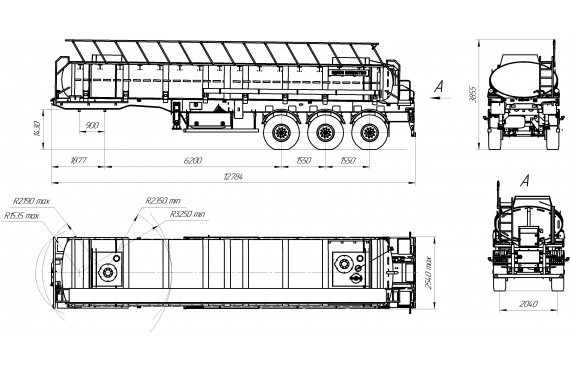 Материал: химстойкое стекловолокно, емкость: 30 куб.м., сечение круглое, конструкция: однослойная или трехслойная (текловолокно + утеплитель + стекловолокно), крепление: при помощи стяжных лент, перевозимые жидкости: нефть, автошины 385/65R22,5; первая ось - подъемная.